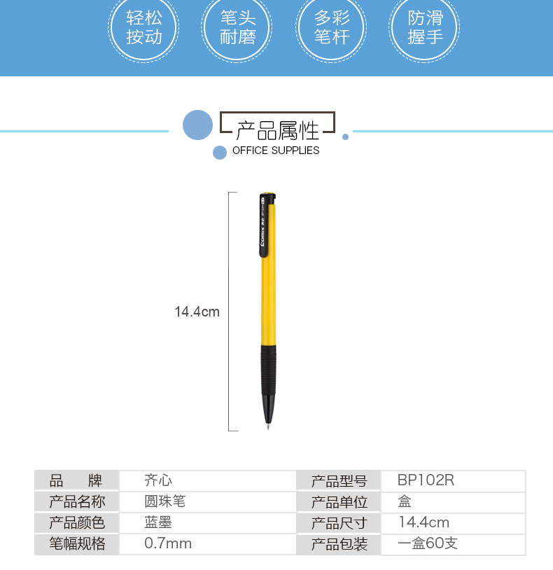 商品名称:齐心(Comix) BP102R 防滑握手圆珠笔 0.7mm 办公文具(600支/箱)