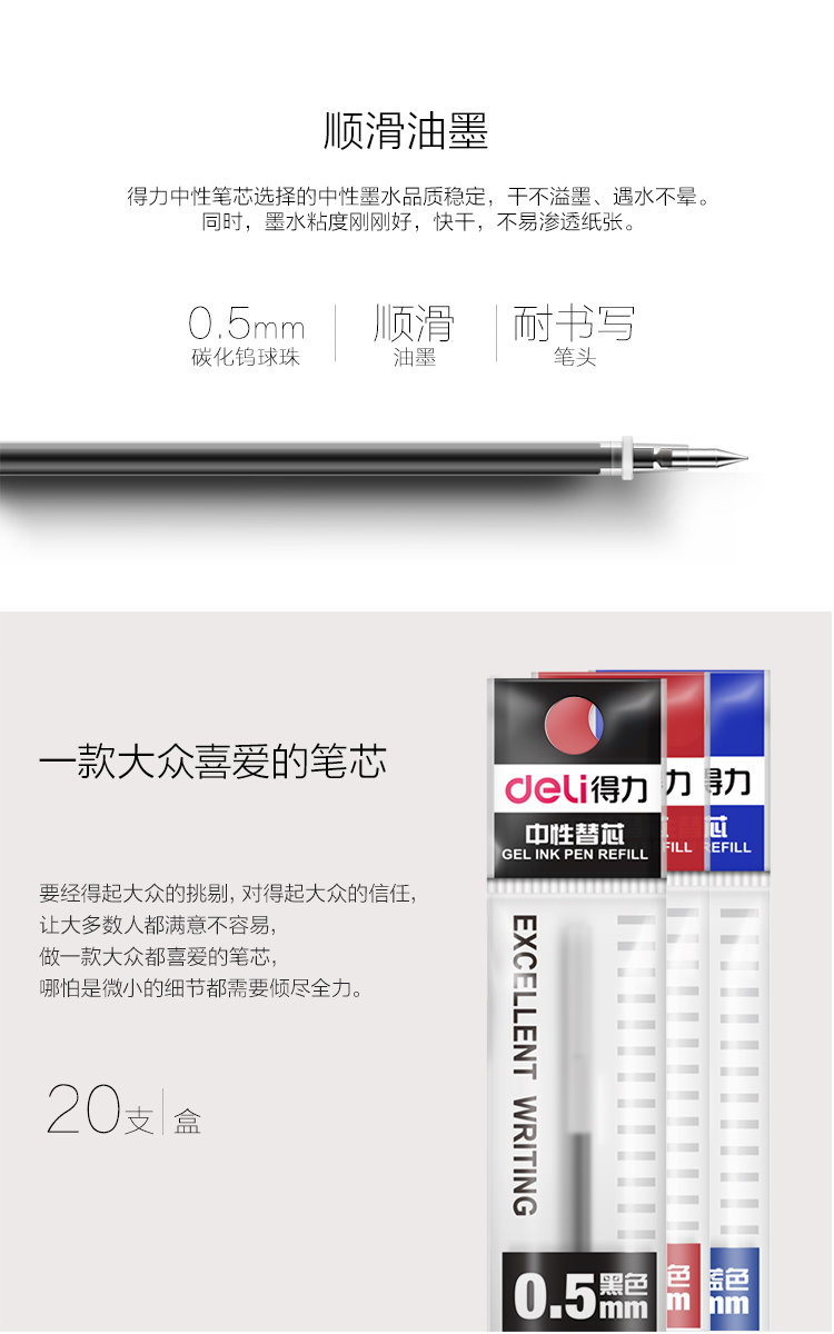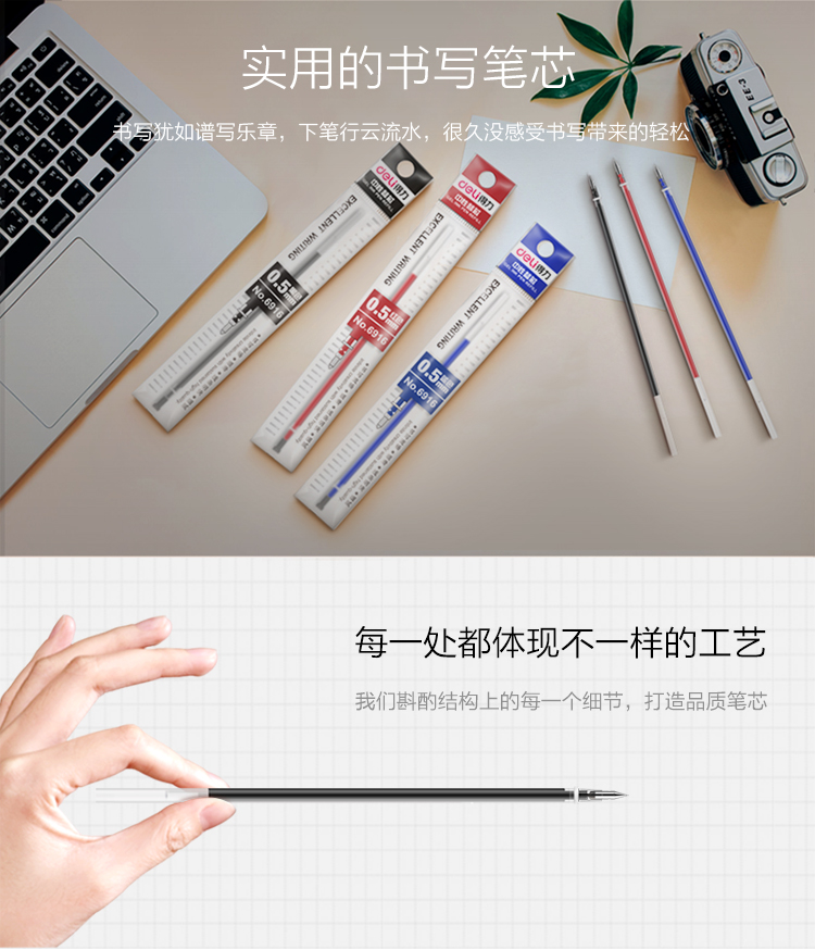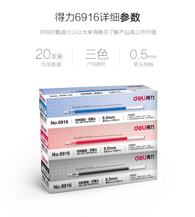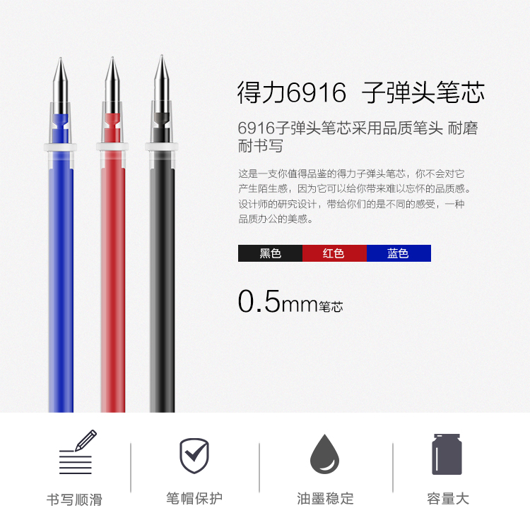 商品名称:得力(deli)0.5mm红色笔芯 签字笔 子弹头替芯 20支/盒6916