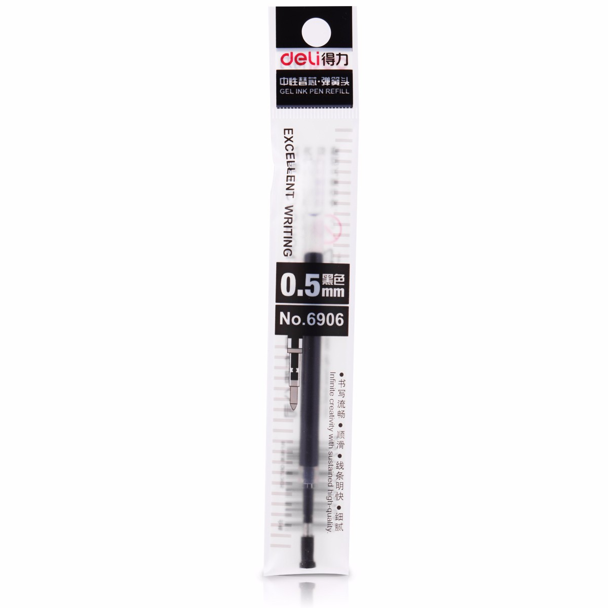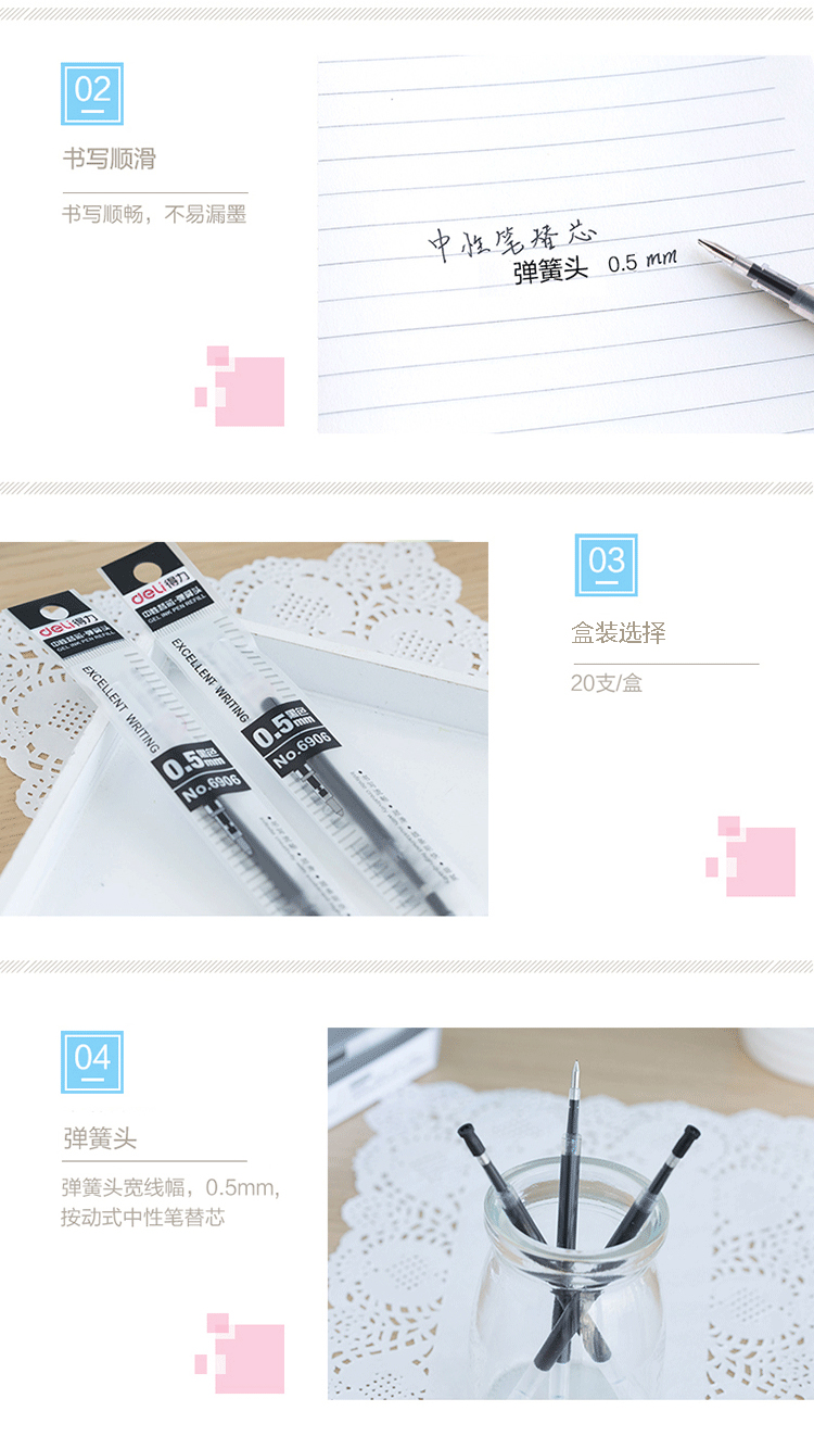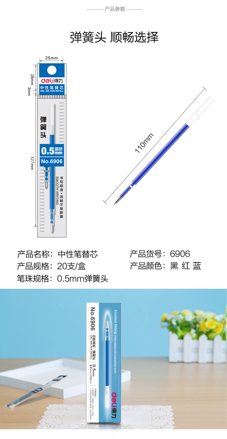商品名称:得力(deli)0.5mm按动式黑色笔芯 中性笔签字笔 子弹头替芯 20支/盒