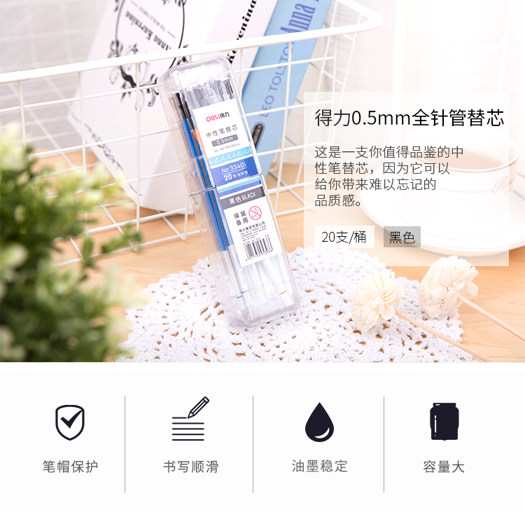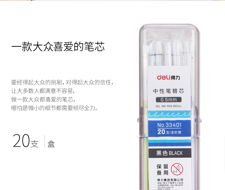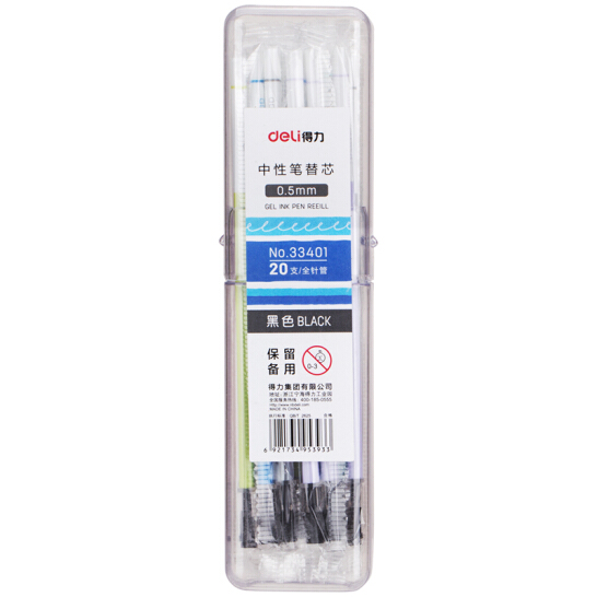 商品名称:得力(deli)0.5mm学生全针管黑色中性笔芯 20支/桶33401