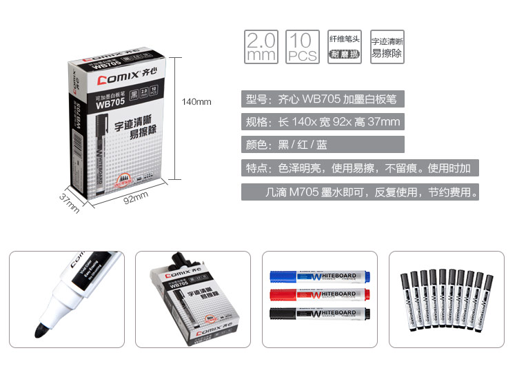 商品名称:齐心(COMIX)WB705 可加墨白板笔10支装 黑色