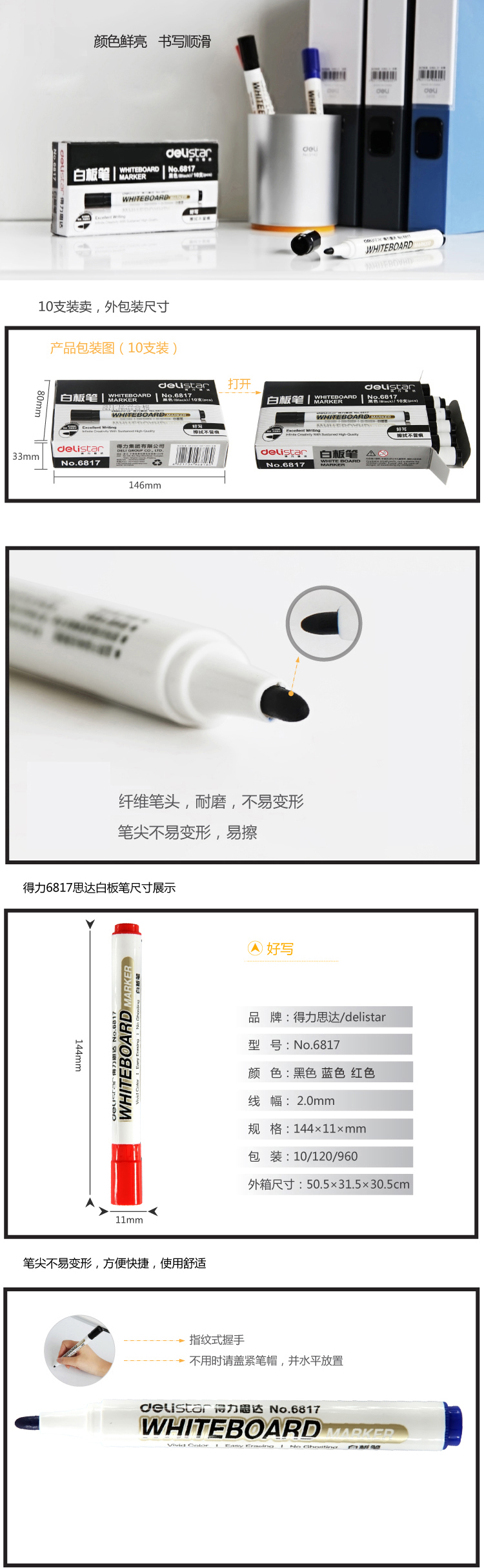 商品名称:得力(deli)色泽明亮可擦易擦白板笔 黑色 10支/盒6817