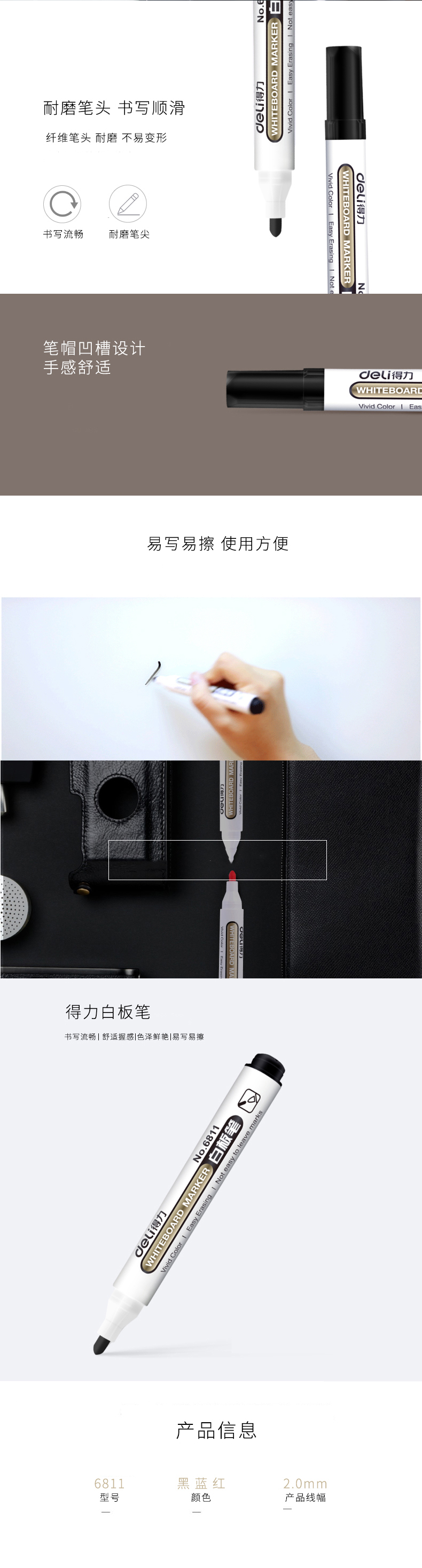 商品名称:得力(deli)办公会议教学可擦易擦白板笔 黑色 10支/盒6801